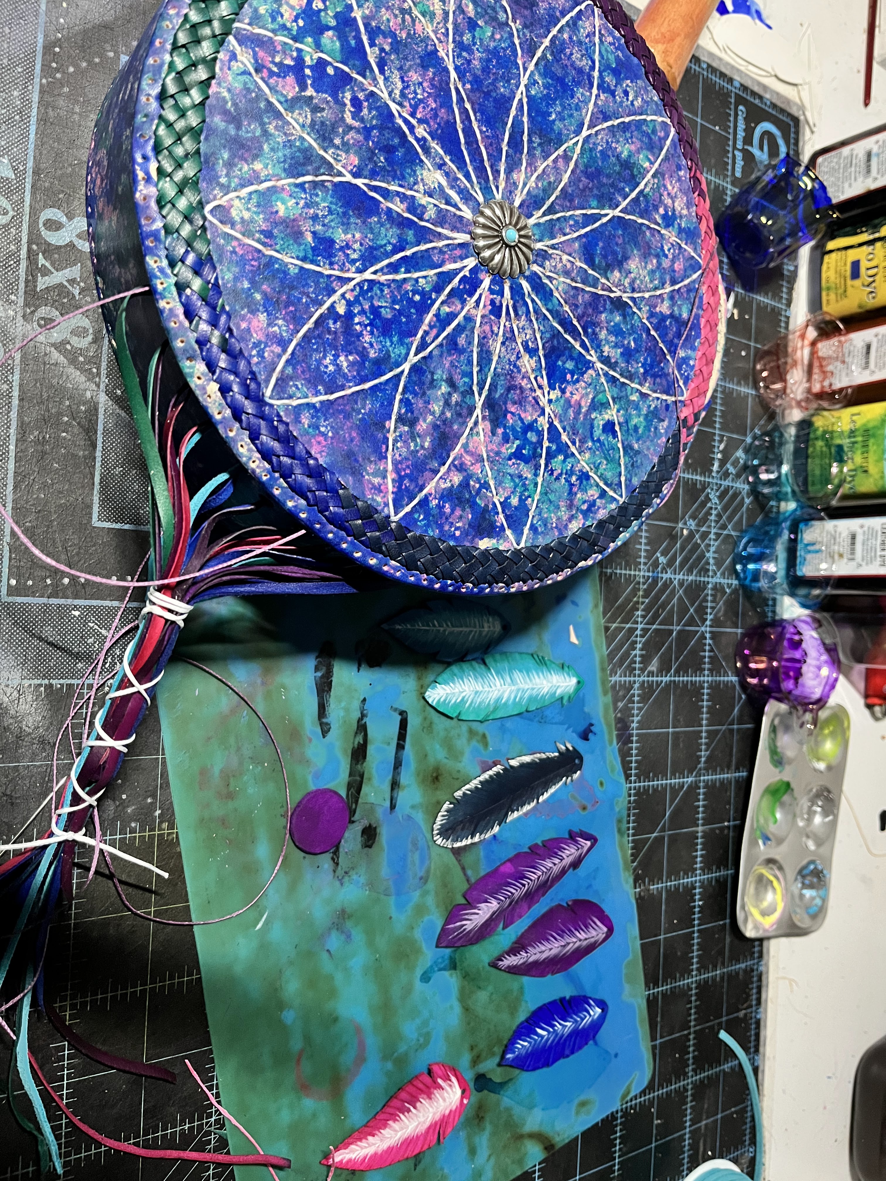 The feathers are made from very thin leather, and each one was dyed and hand painted to match.